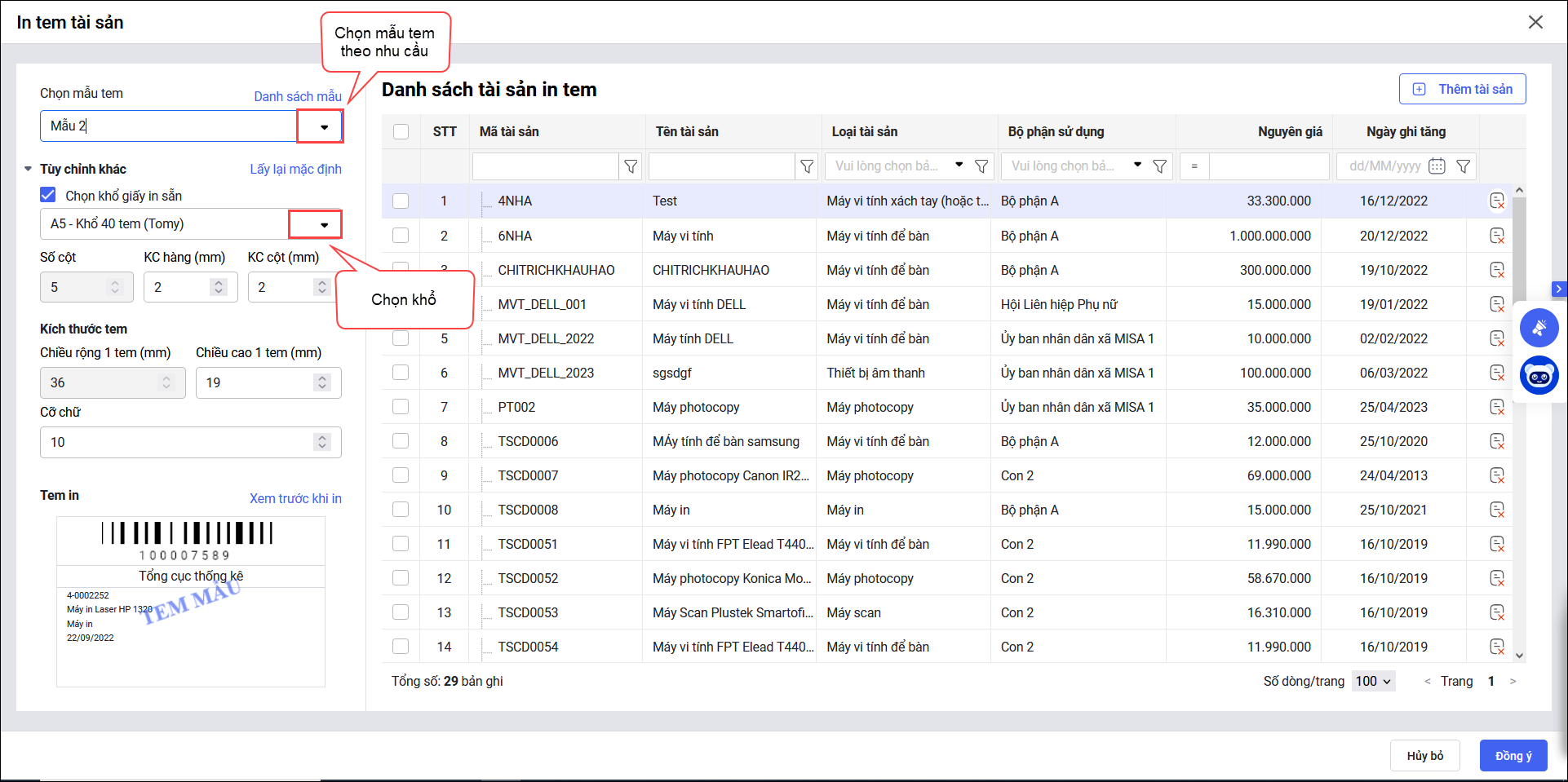 Bước 2: In tem gắn mã vạch cho tài sản