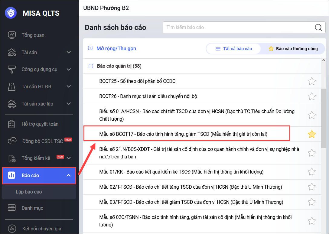 Bước 1. Trên phần mềm QLTS.VN \ Chọn menu Báo cáo\Báo cáo quản trị, chọn Báo cáo tình hình tăng, giảm TSCĐ (Mẫu hiển thị giá trị còn lại)