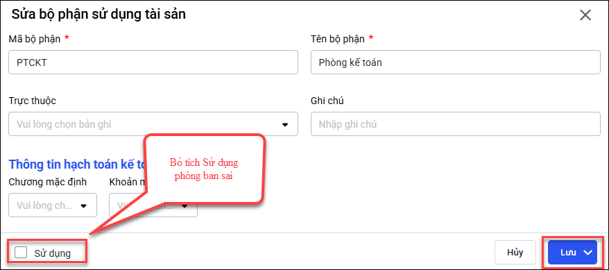 Lưu ý: Sau khi bỏ tích Sử dụng, phòng ban sẽ không còn hiển thị khi lựa chọn trong các chứng từ mới, nhưng dữ liệu lịch sử vẫn được giữ nguyên để phục vụ báo cáo và tra cứu.