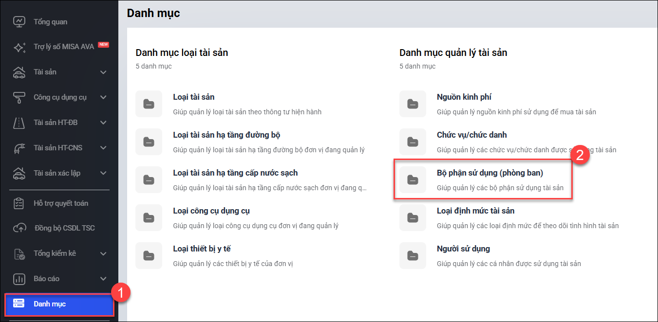 • Vào Danh mục\Bộ phận sử dụng (phòng ban).