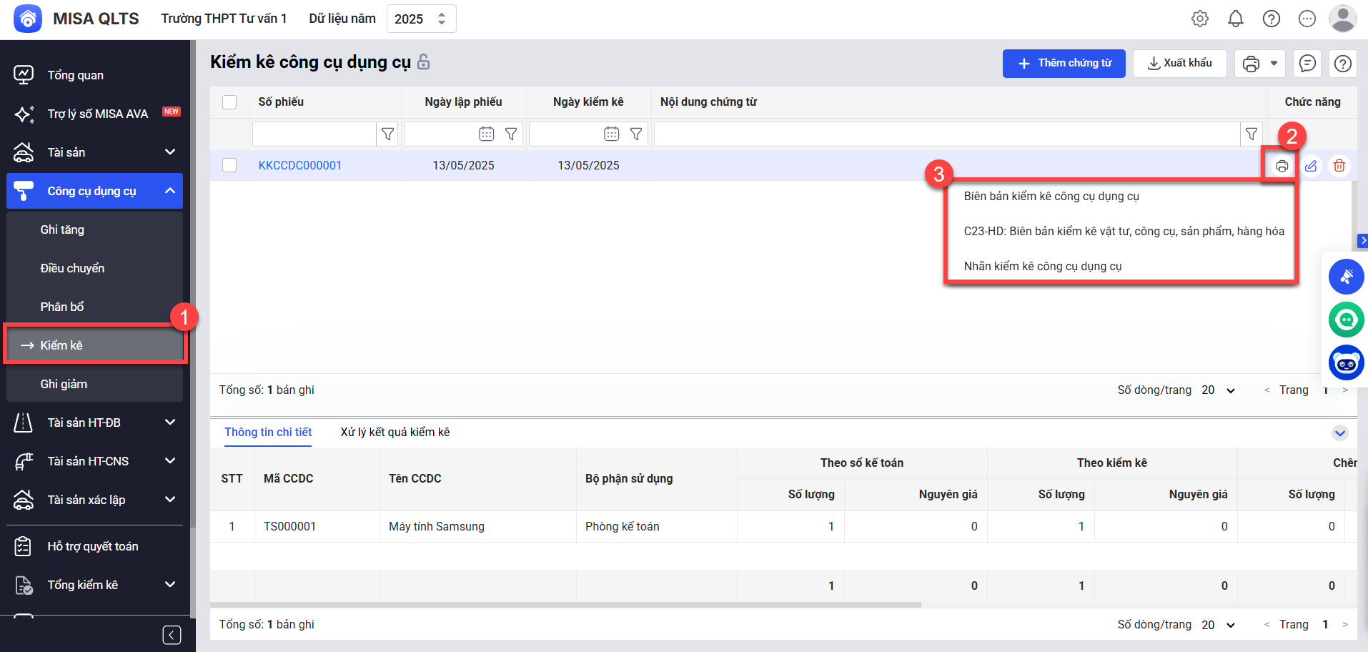 - Cách 1: In trên giao diện Kiểm kê công cụ dụng cụ