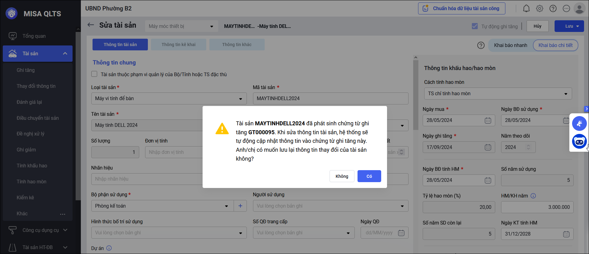 Bước 3: Nhấn Lưu, phần mềm hiện thông báo “Tài sản … đã có có phát sinh chứng từ ghi tăng … Khi sửa thông tin tài sản, hệ thống sẽ tự động cập nhật thông tin vào chứng từ ghi tăng này. Bạn có muốn lưu lại thông tin thay đổi của tài sản không?”. Nhấn Có.