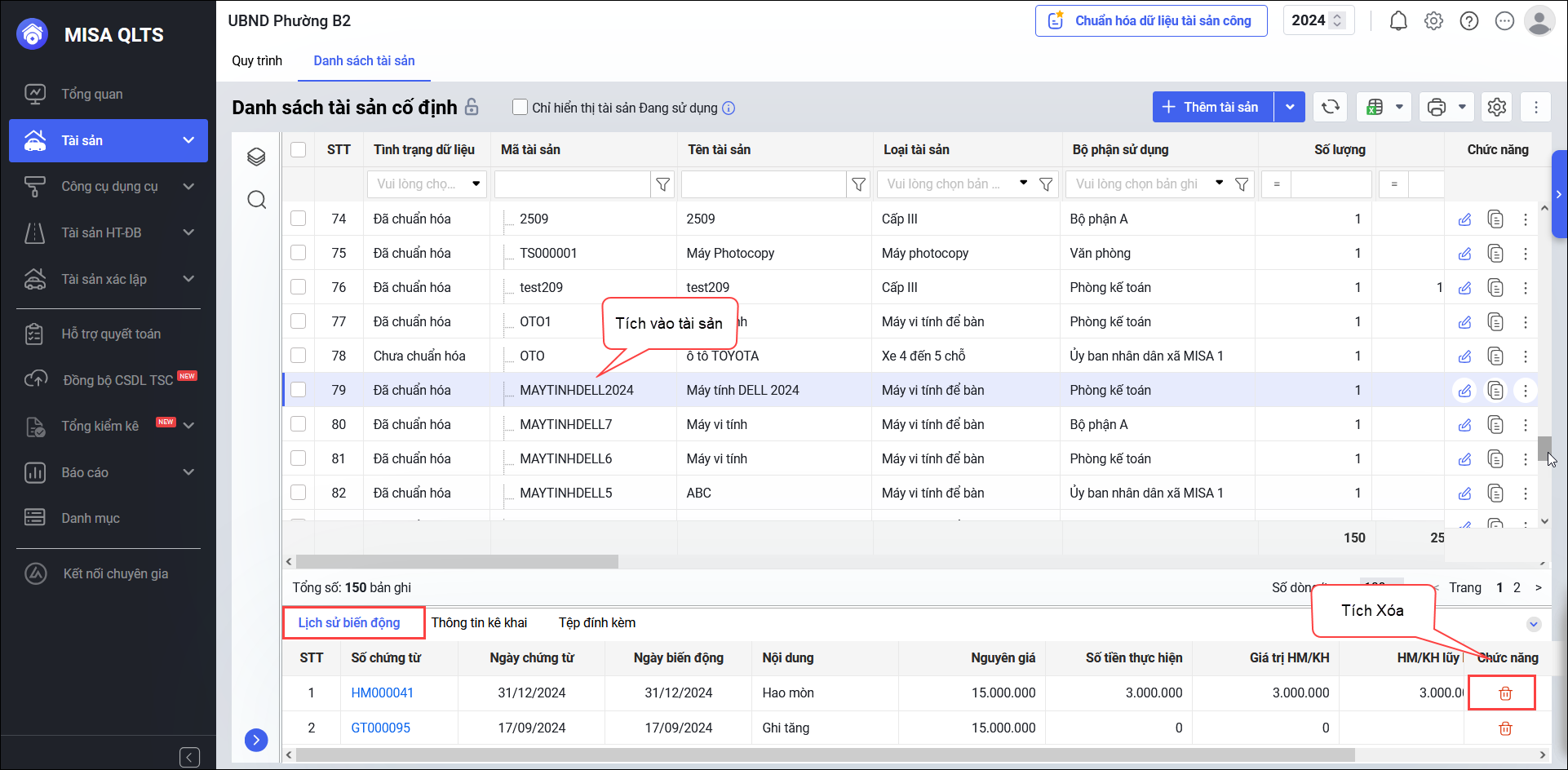 Bước 1: Xóa các chứng từ phát sinh liên quan trước bằng cách nhấp chuột vào tài sản đó chọn Lịch sử biến động/Tích nút Xóa ở cuối dòng chứng từ