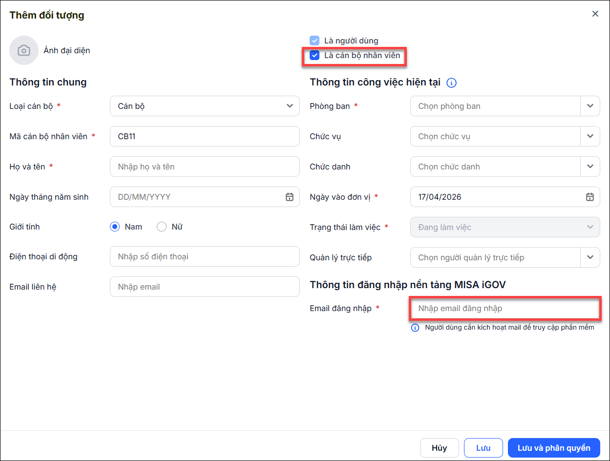 - Tích Là cán bộ nhân viên nếu người dùng là cán bộ nhân viên.
