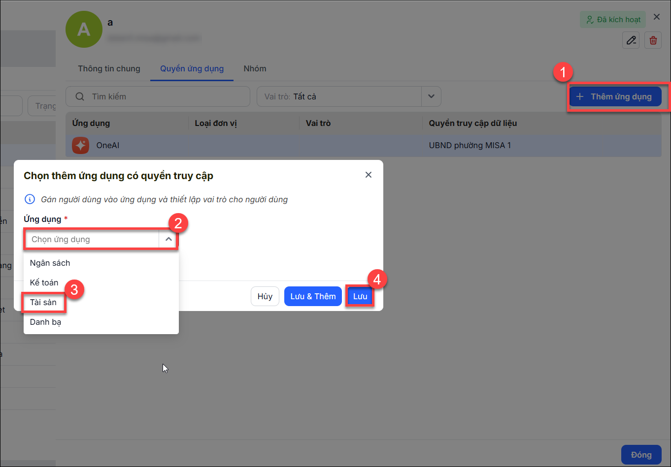 Bước 6: Nhấn Thêm ứng dụng\ chọn ứng dụng Tài sản sau đó nhấn Lưu.