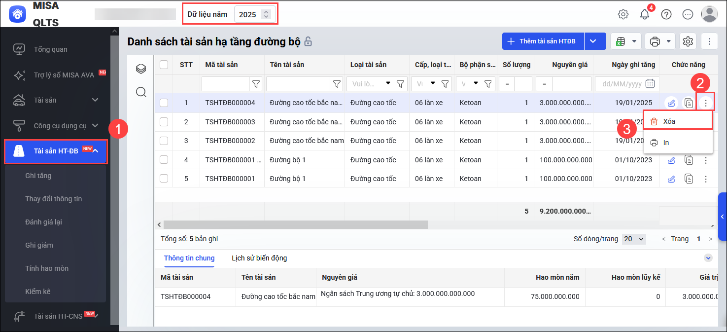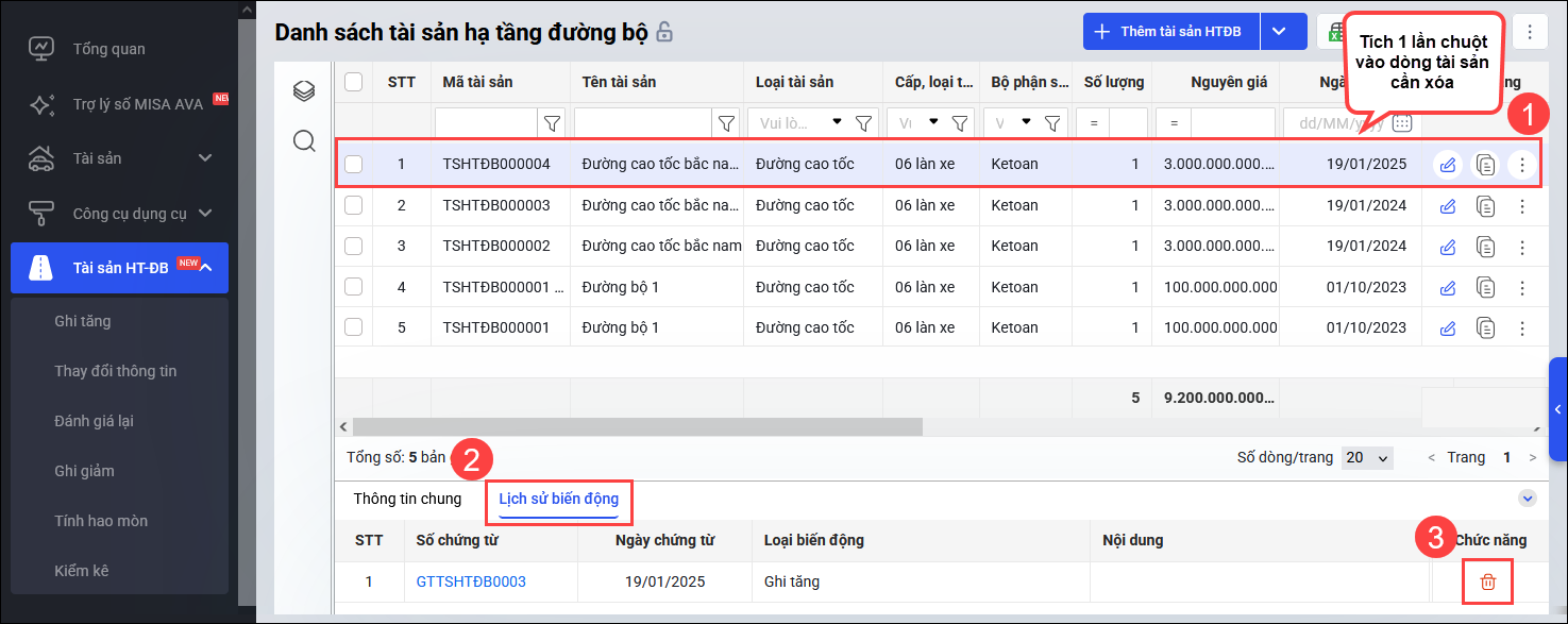 Để xóa tài sản hạ tầng đường bộ (HT-ĐB) do nhập không đúng, thực hiện theo hướng dẫn sau: