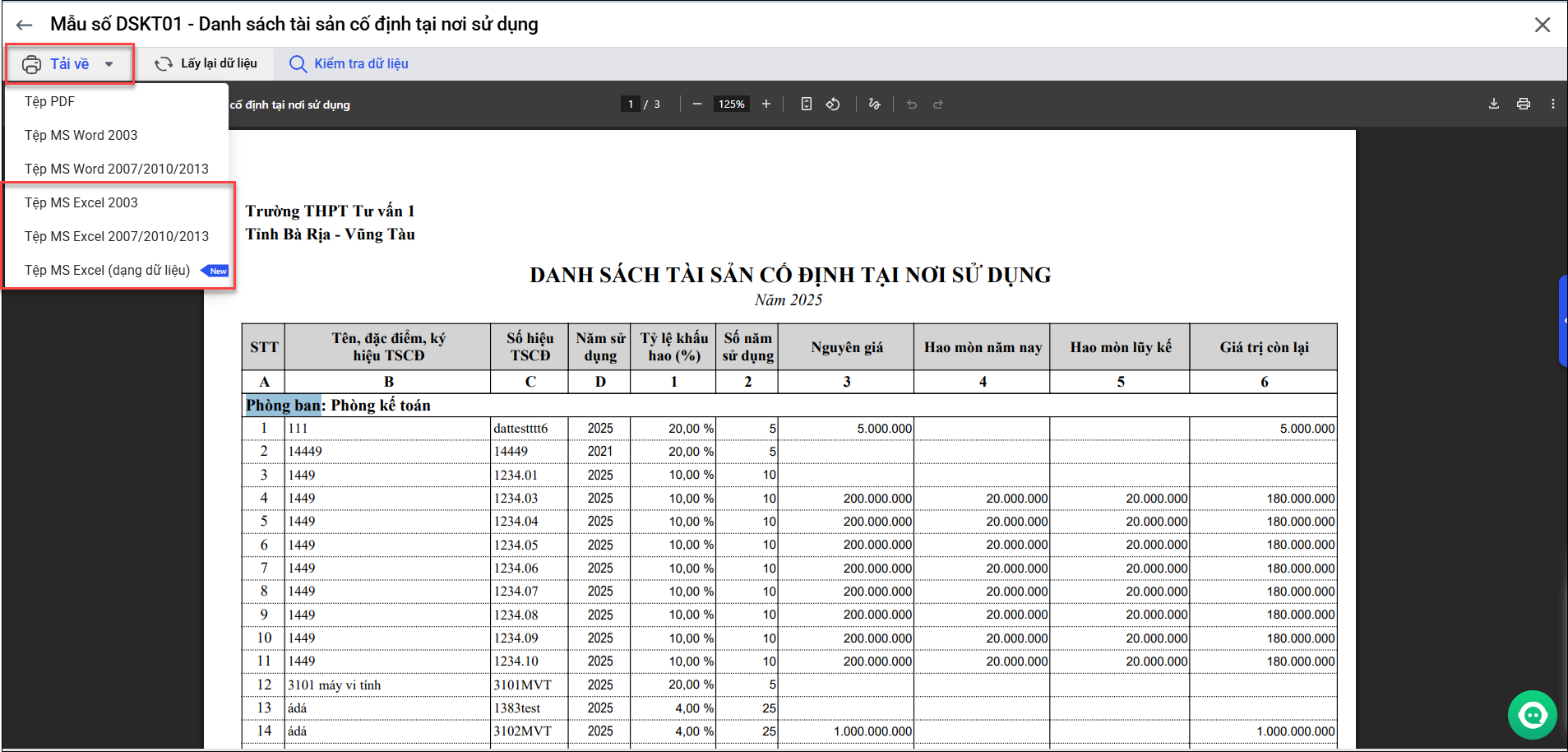 Trường hợp 2: Đơn vị muốn xuất khẩu danh sách tài sản chi tiết để lưu trữ tại đơn vị