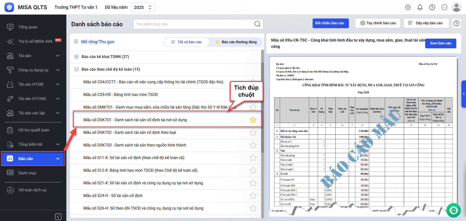 Bước 1: Tại menu Báo cáo\ Báo cáo theo chế độ kế toán\ chọn Mẫu số DSKT01 – Danh sách tài sản cố định tại nơi sử dụng. Tích đúp vào báo cáo để xem.