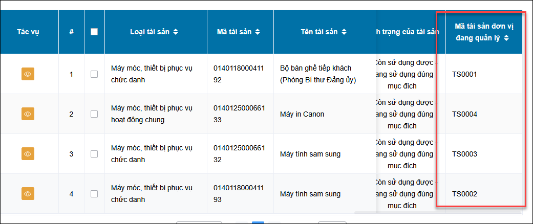 Tại danh sách tài sản, anh/chị nhấn mở chi tiết một tài sản bất kỳ và tìm đến trường thông tin “Mã tài sản đơn vị đang quản lý”.
