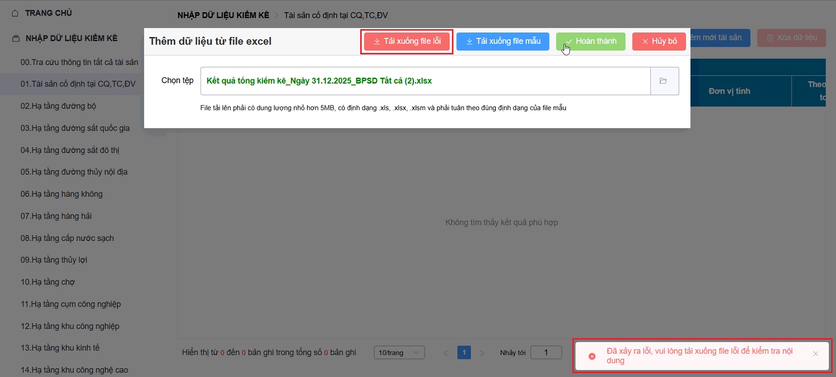 2.9. Vì sao tải báo cáo tổng kiểm kê tài sản lên hệ thống nhưng báo lỗi hoặc không tải được?
