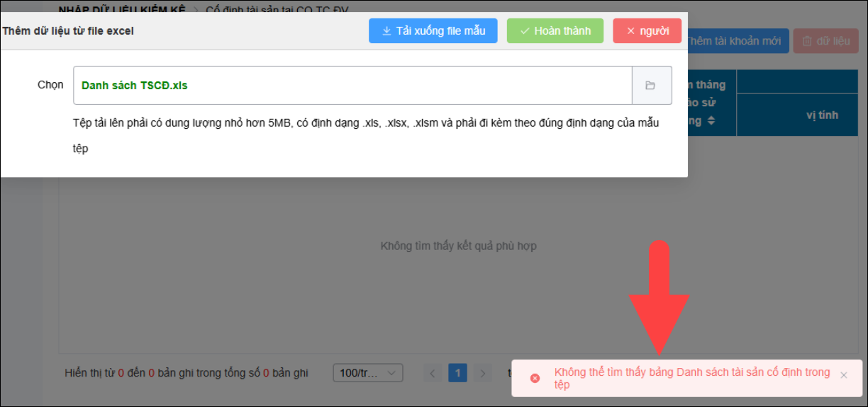 • Nhập khẩu file excel vào Tổng kiểm kê bị báo lỗi “Không thể tìm thấy bảng Danh sách tài sản cố định trong tệp