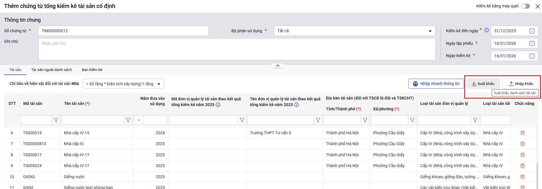 • Hoặc xuất khẩu excel không hiện biên bản tổng kiểm kê mà lại lên danh sách tài sản