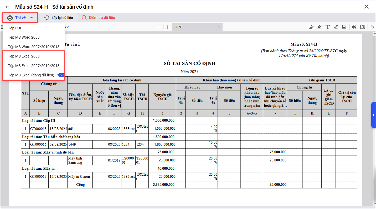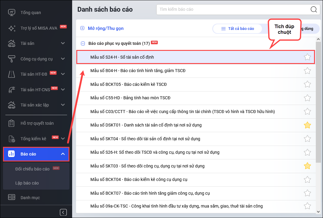 Ví dụ như báo cáo Mẫu số S24-H – Sổ Tài sản cố định