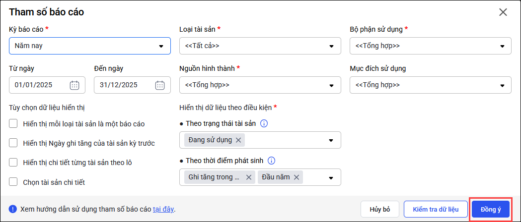 - Phần mềm hiển thị ra tham số báo cáo, chọn năm muốn xem báo cáo và các thông tin cần quan tâm. Nhấn Đồng ý