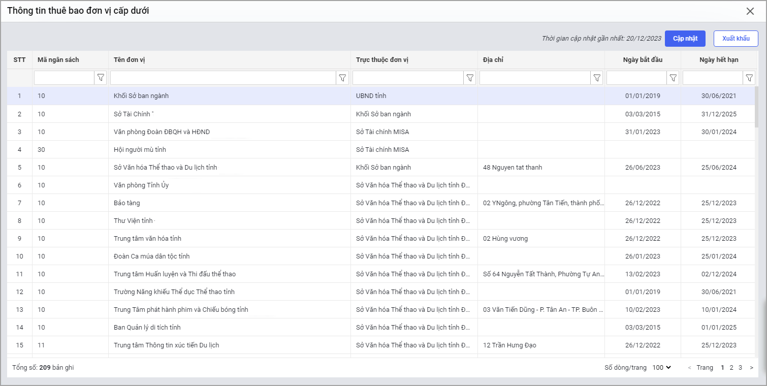- Phần mềm sẽ hiển thị các thông tin bao gồm: Mã Ngân sách, Tên đơn vị, Trực thuộc đơn vị, Địa chỉ, Ngày bắt đầu, Ngày hết hạn.