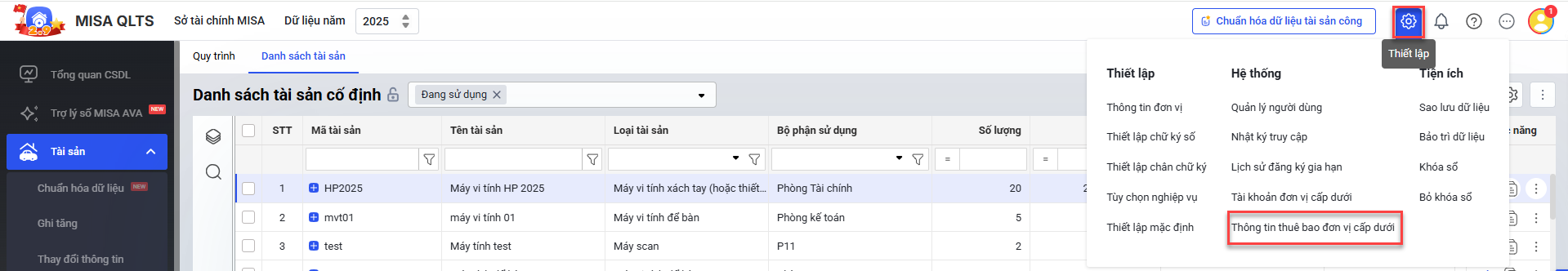 - Chọn Thiết lập\ Thông tin thuê bao đơn vị cấp dưới.