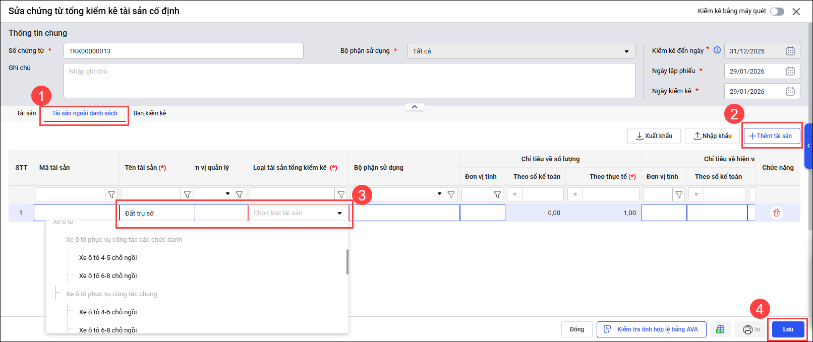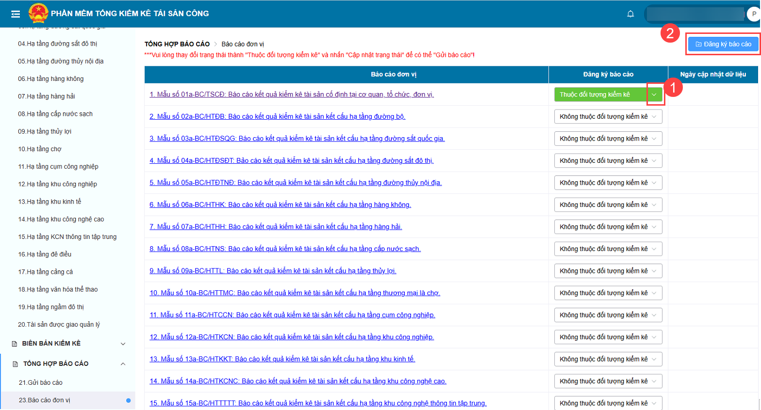 - Bước 4: Đăng ký báo cáo cần lập trên phần mềm Tổng kiểm kê và cập nhật số liệu lên báo cáo kết quả kiểm kê (mẫu số 01a-BC/TSCĐ)
