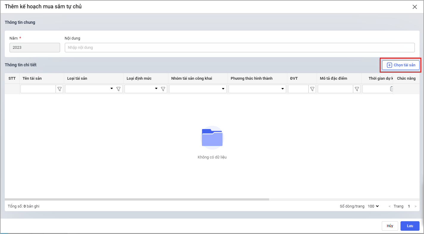 Bước 3. Mặc định thông tin năm hiện tại, nhập Nội dung kế hoạch mua sắm tự chủ. Nhấn Chọn tài sản