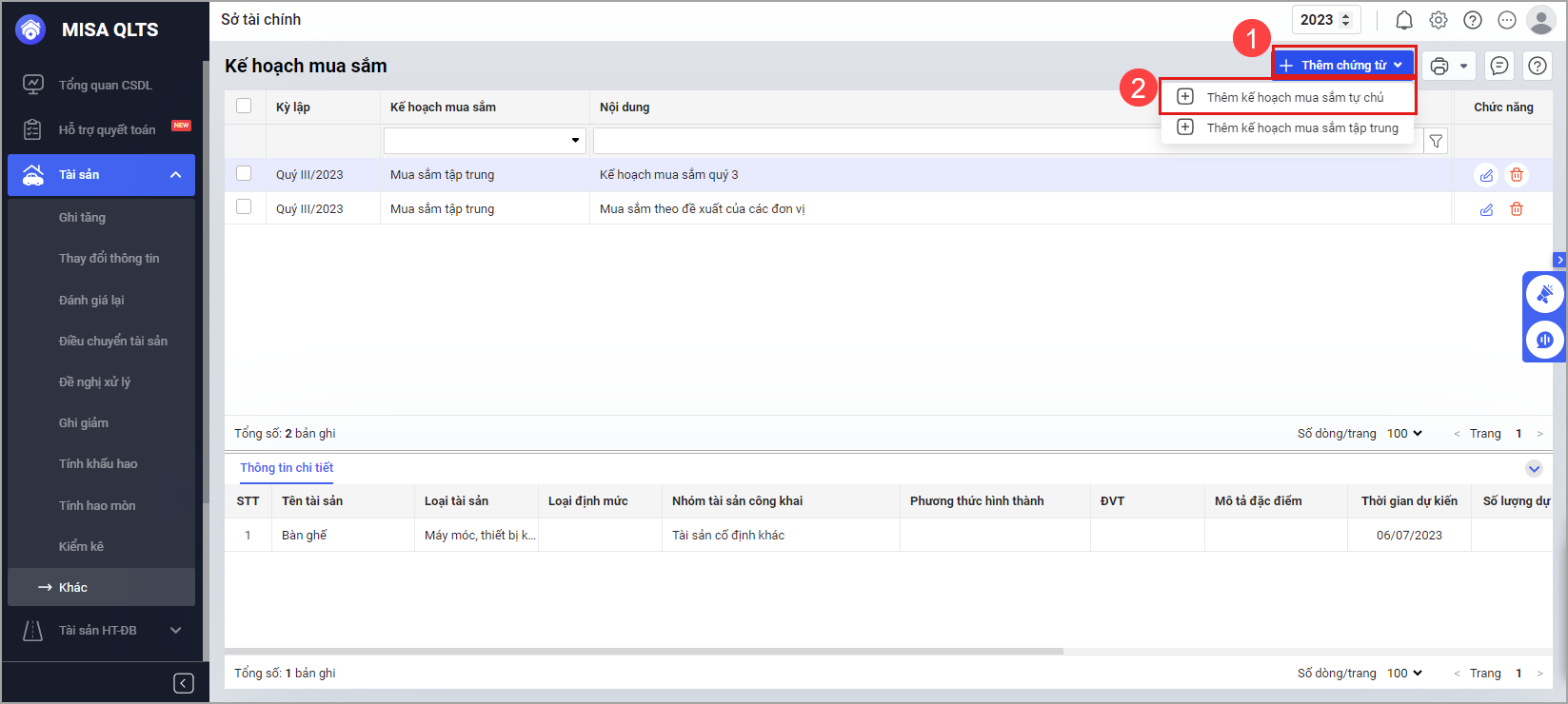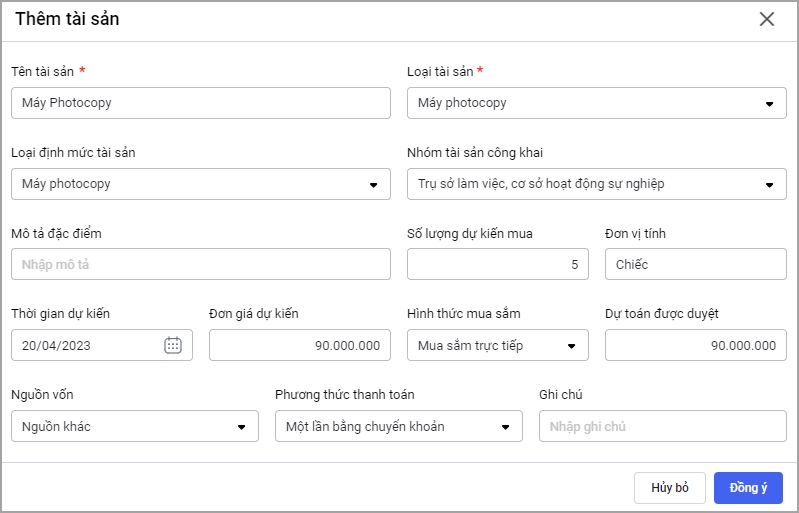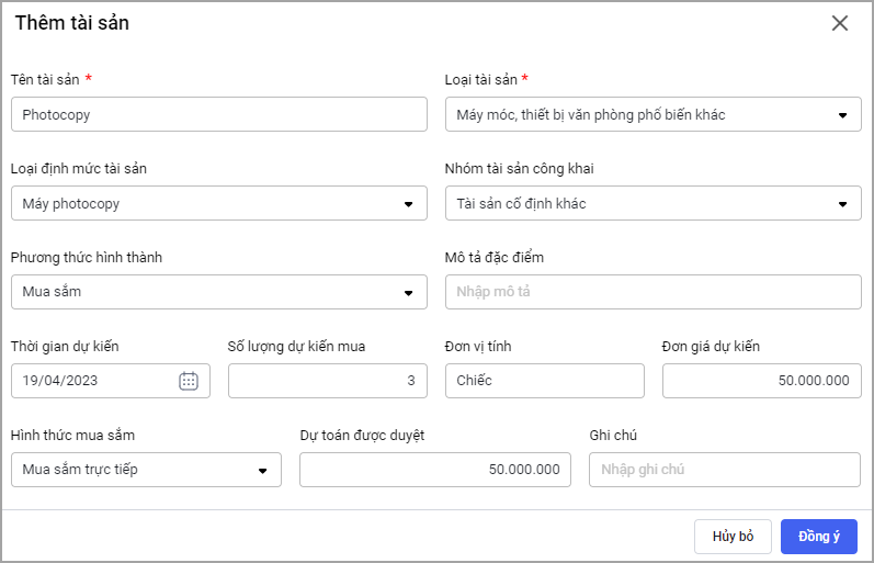 - Nhấn Đồng ý để thêm tài sản vào kế hoạch mua sắm.