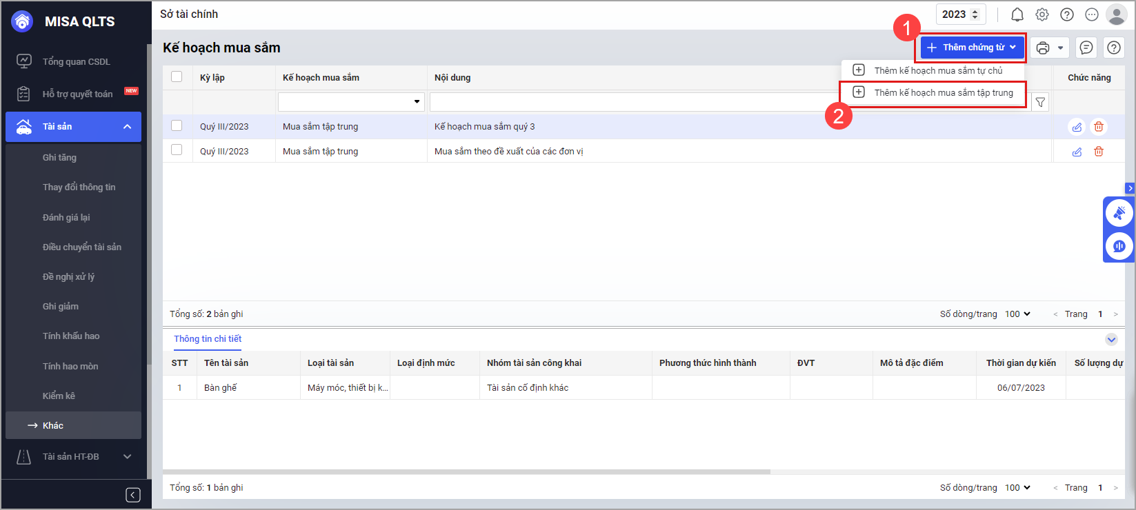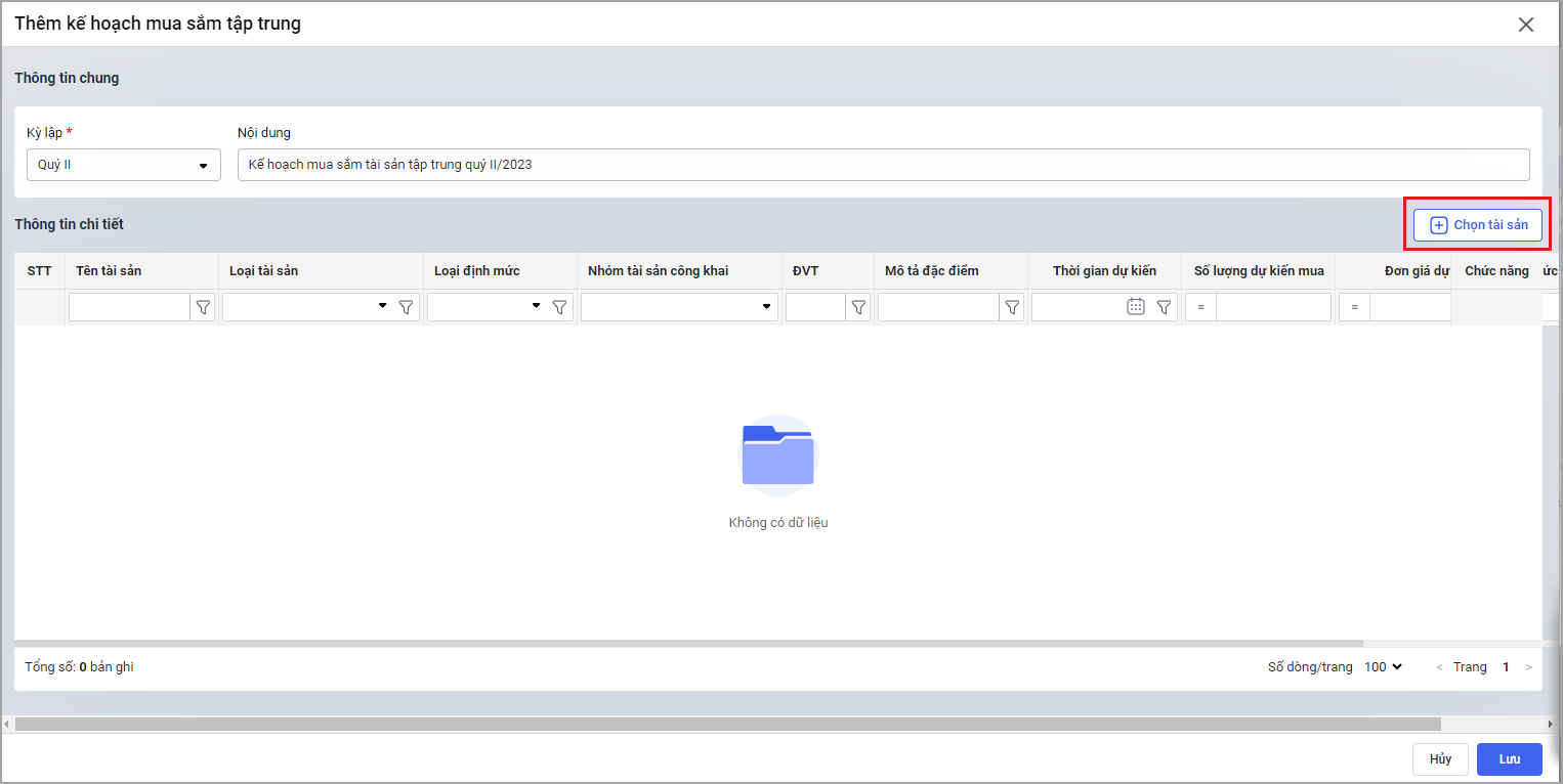 Bước 4. Nhấn Chọn tài sản để thêm tài sản vào kế hoạch mua sắm.