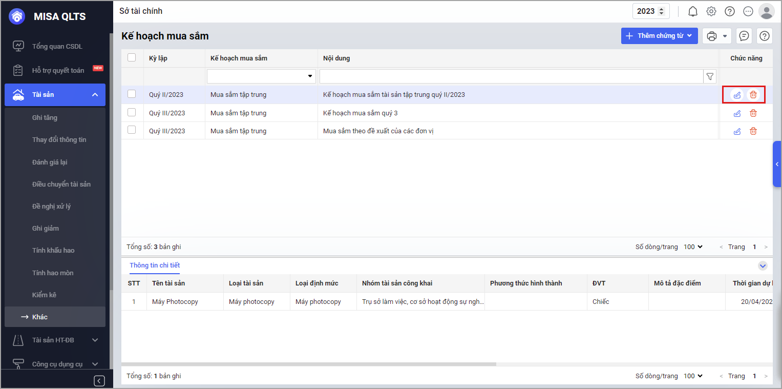 2.2. Chỉnh sửa, xóa kế hoạch mua sắm và in Bảng tổng hợp kế hoạch mua sắm hoặc Mẫu số 03-TSC-MSTT – Bảng tổng hợp nhu cầu mua sắm tập trung.