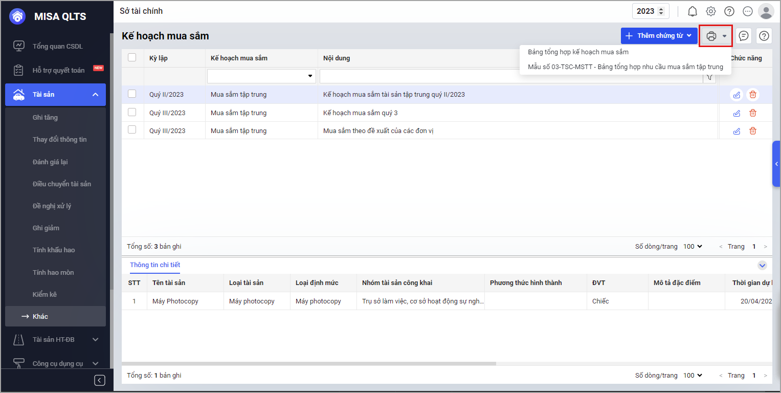 - Để phục vụ công tác lưu trữ, báo cáo, bạn có thể in Bảng tổng hợp kế hoạch mua sắm hoặc Mẫu số 03-TSC-MSTT – Bảng tổng hợp nhu cầu mua sắm tập trung.