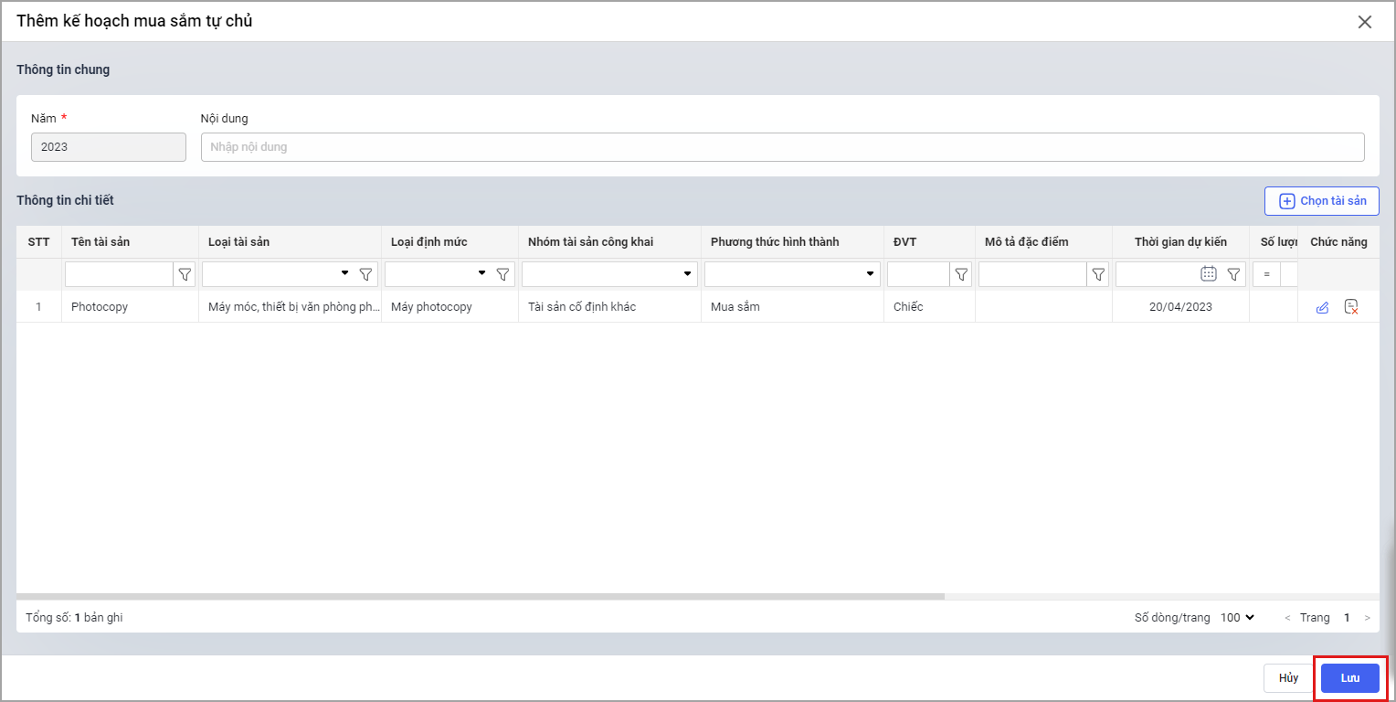 Bước 4. Nhấn Lưu để thêm kế hoạch mua sắm tự chủ.