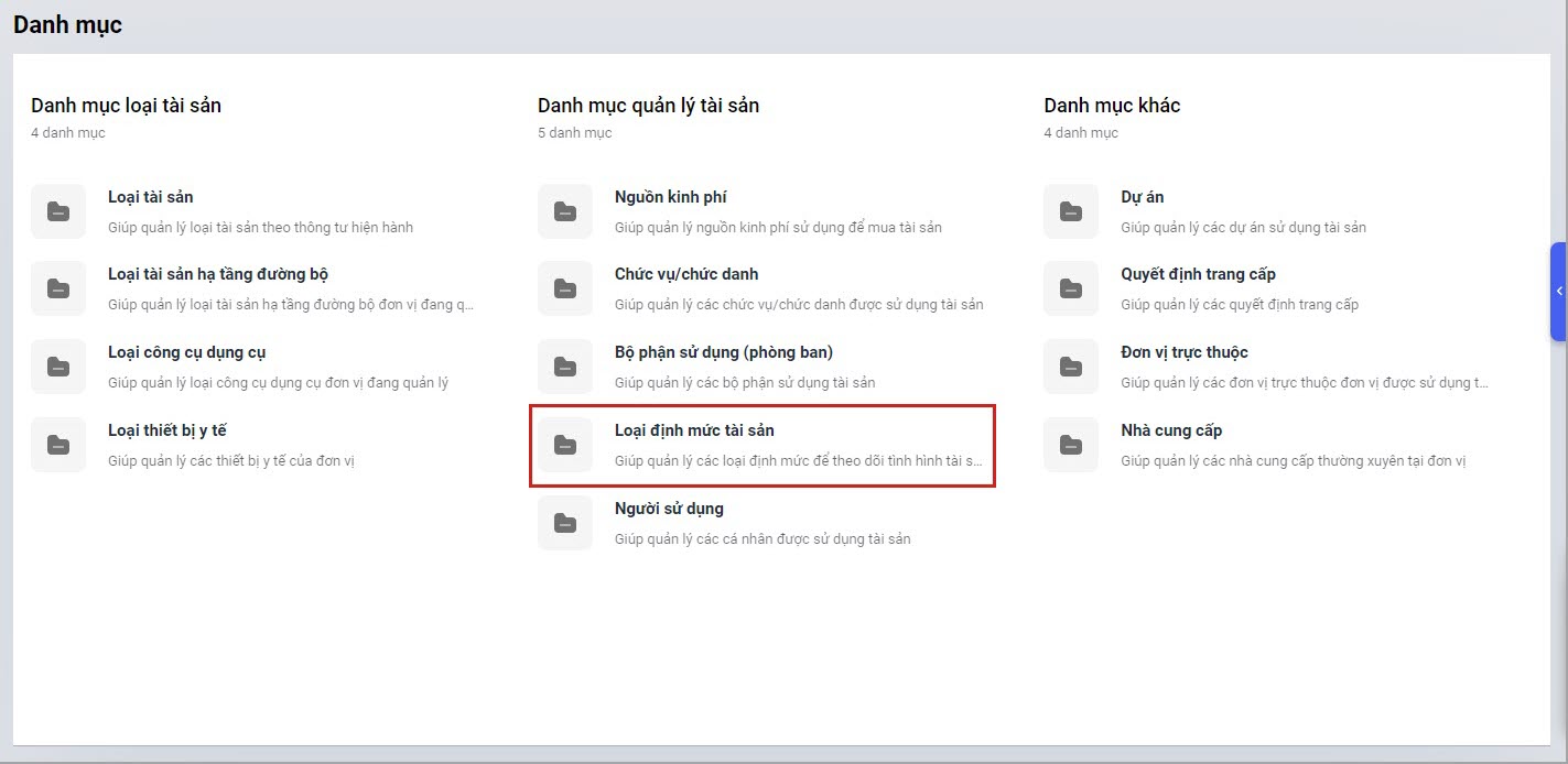 - Bước 2: Kích đúp chuột vào Loại định mức tài sản.