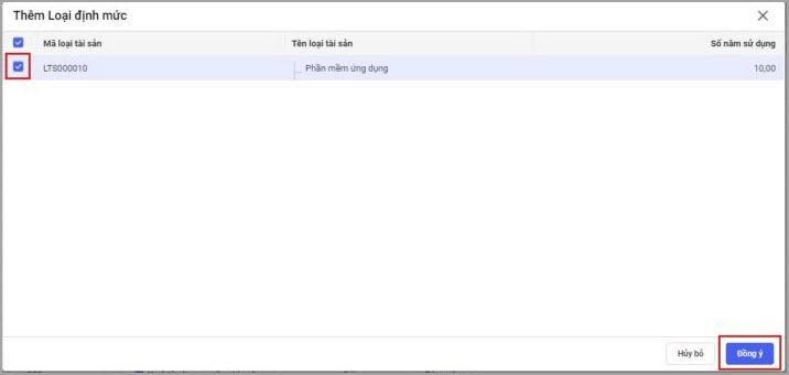 - Bước 4: Tích chọn 1 hoặc nhiều tài sản mang sang danh mục định mức. Nhấn Đồng ý.
