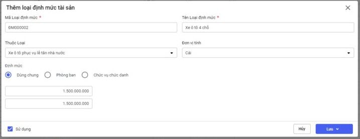 - Nhập số lượng Định mức cho tài sản.