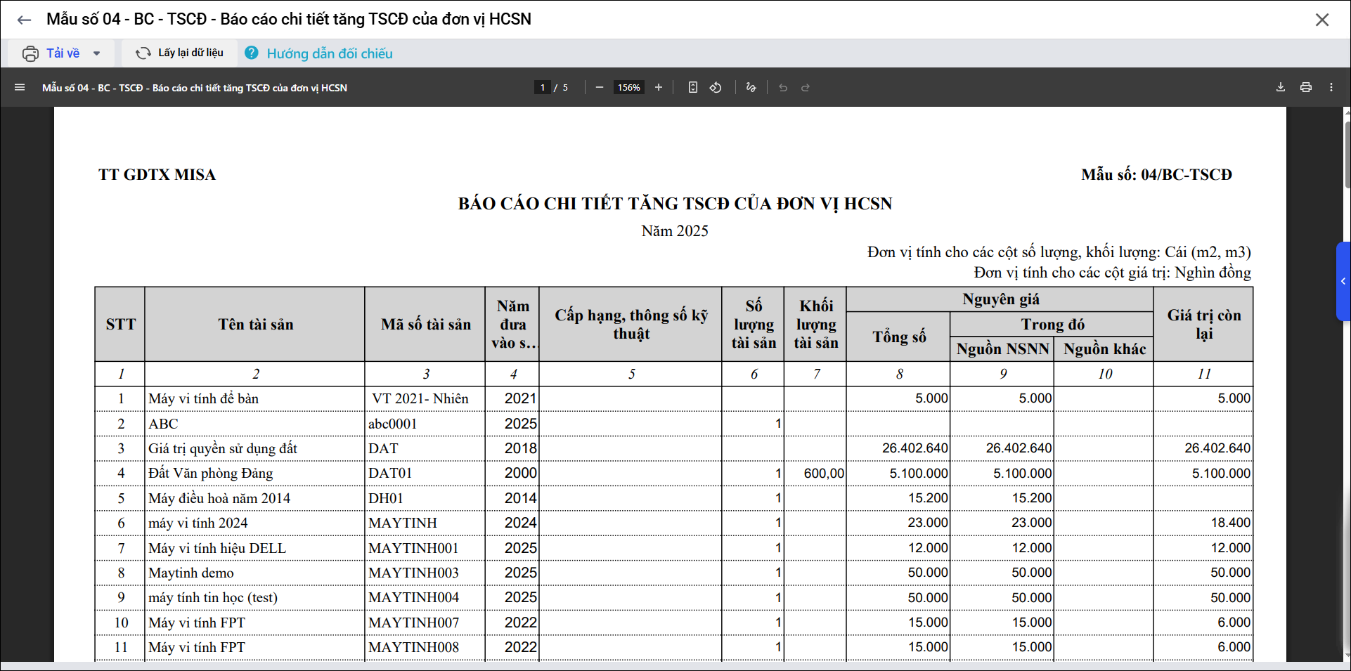 • Nguyên giá, Giá trị còn lại lấy theo giá trị của tài sản trong chứng từ ghi tăng có ngày chứng từ thuộc kỳ báo cáo.