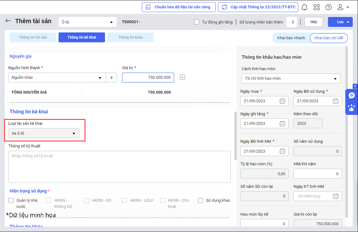- Báo cáo cần lập vào các tháng có ghi tăng tài sản là xe ô tô. Tài sản ghi tăng trong kỳ báo cáo cần đảm bảo có Loại tài sản kê khai là Xe ô tô trong tại mục Thông tin kê khai.