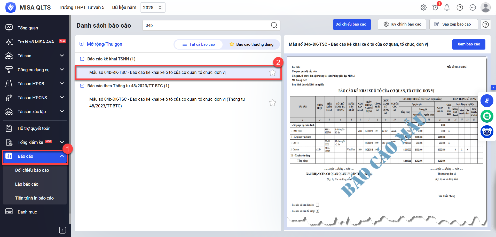 Để in được Mẫu số 04b-ĐK-TSC – Báo cáo kê khai xe ô tô của cơ quan, tổ chức, đơn vị, anh/chị thực hiện các bước sau: