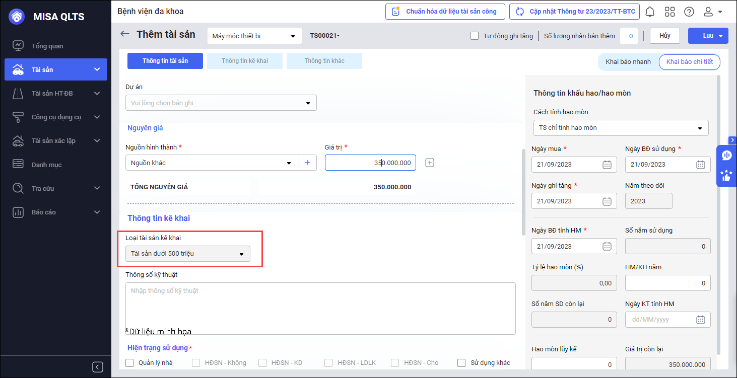 • Theo Thông tư số 144/2017/TT-BTC yêu cầu kê khai tất cả tài sản khác, không phân biệt nguyên giá tài sản phải trên 500 triệu như trước đây. Vì vậy, tài sản ghi tăng trong kỳ báo cáo cần đảm bảo Loại tài sản kê khai là “Tài sản khác trên 500 triệu” và “Tài sản khác dưới 500 triệu” tại mục Thông tin kê khai. (Lấy theo thông tin Loại tài sảnNguyên giá đã khai báo).