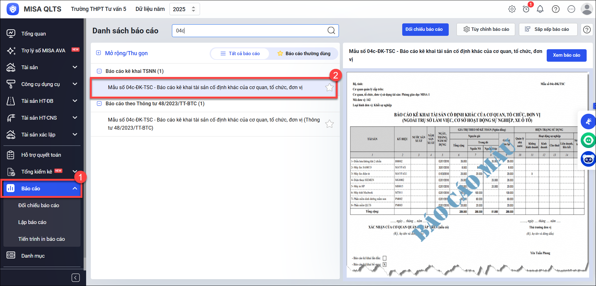 Bước 1: Vào menu Báo cáo\Báo cáo kê khai TSNN\ chọn Mẫu số 04c-ĐK-TSC – Báo cáo kê khai tài sản cố định khác của cơ quan, tổ chức, đơn vị.