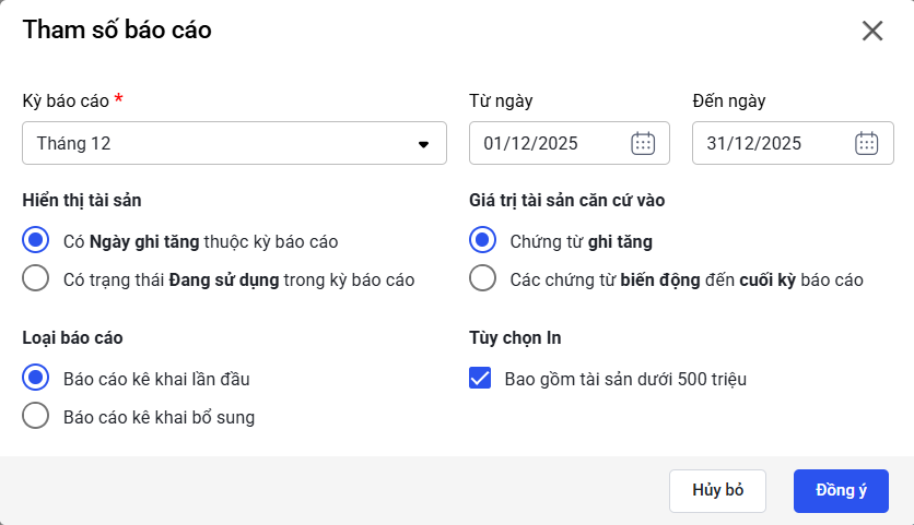 • Nếu tích chọn “Có Ngày ghi tăng thuộc kỳ báo cáo” phần mềm chỉ lấy lên các tài sản được ghi tăng trong kỳ báo cáo