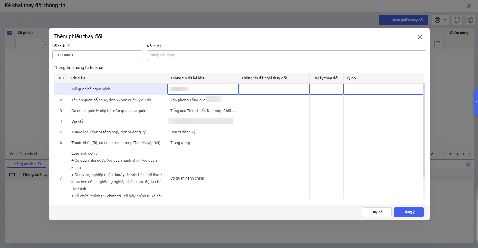 • Nhấn chọn từng dòng tương ứng tại cột Thông tin đề nghị thay đổi để nhập thông tin mới.