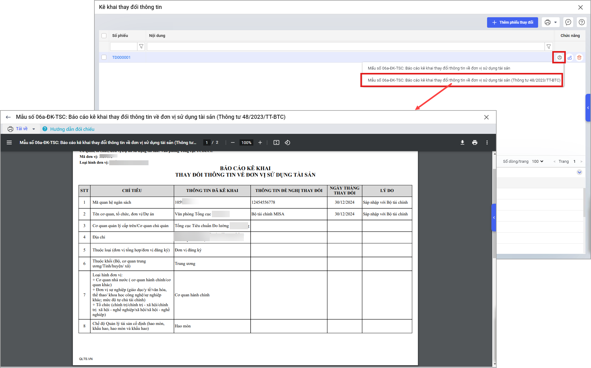 Hướng dẫn kê khai thông tin thay đổi về đơn vị sử dụng tài sản theo biểu mẫu Mẫu số 06a-ĐK-TSC