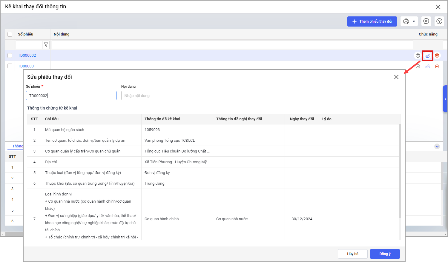 • Hoặc chỉnh sửa thông tin phiếu bằng cách nhấn đúp chuột hoặc chọn vào biểu tượng cây bút.