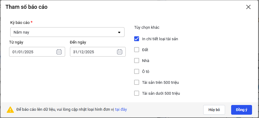 Nguyên nhân: Có thể do chọn sai tham số khi in báo cáo. Cụ thể, Anh/chị đã tích chọn “In chi tiết theo loại tài sản” tại mục Tùy chọn khác nhưng lại không chọn bất kỳ loại tài sản nào (Đất, Nhà, Ô tô,…), dẫn đến báo cáo không có dữ liệu hiển thị.
