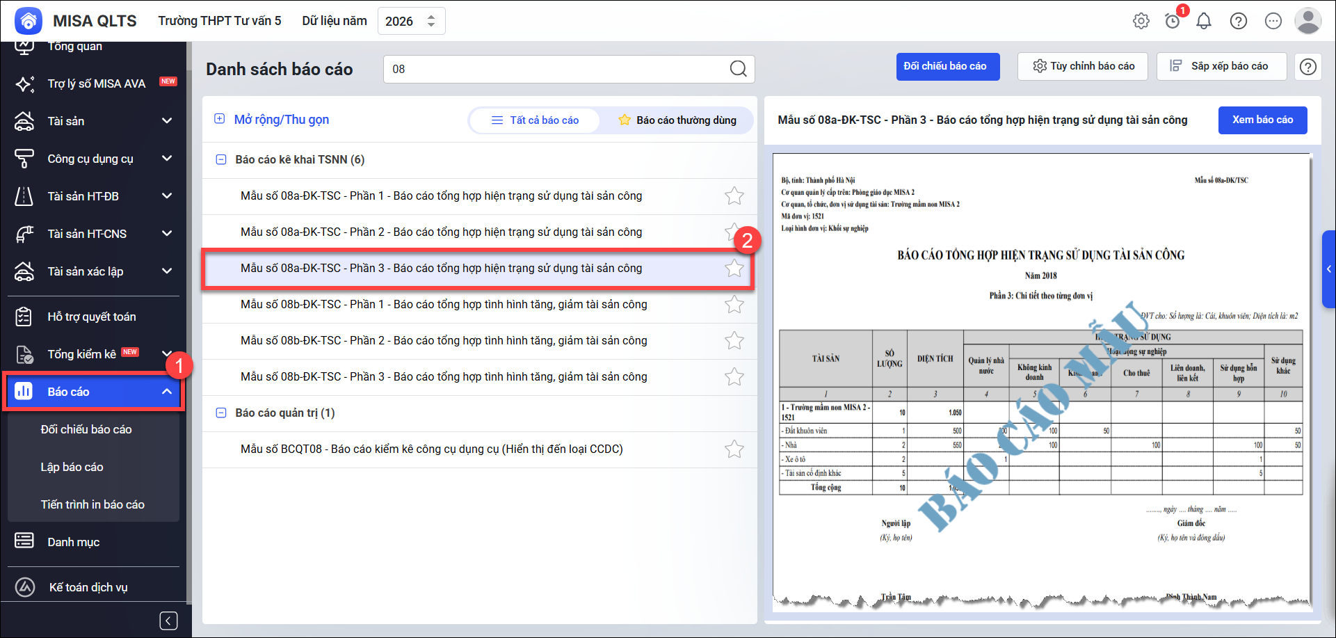 Bước 1: Vào menu Báo cáo\Báo cáo kê khai TSNN\chọn Mẫu số 08a-ĐK-TSC – Phần 3 – Báo cáo tổng hợp hiện trạng sử dụng tài sản công.