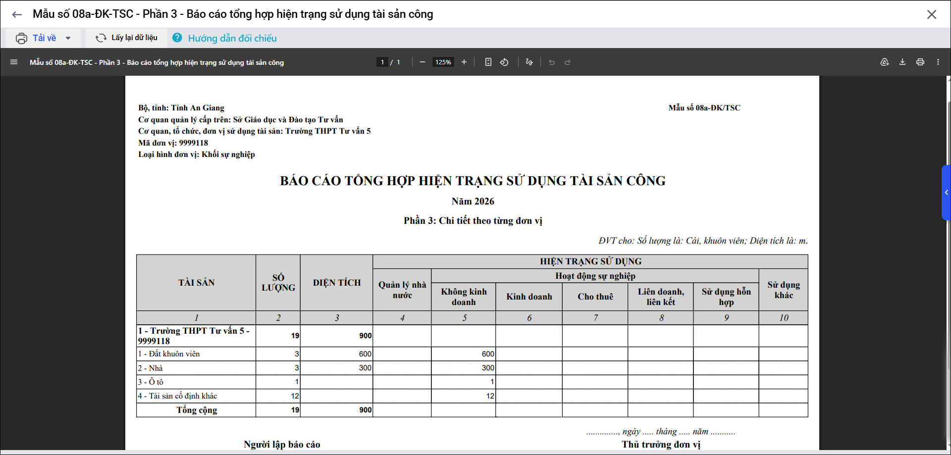 Bài viết này giúp Anh/chị in được Mẫu số 08a-ĐK-TSC – Phần 3 – Báo cáo tổng hợp hiện trạng sử dụng tài sản công (mẫu 08a phần 3).