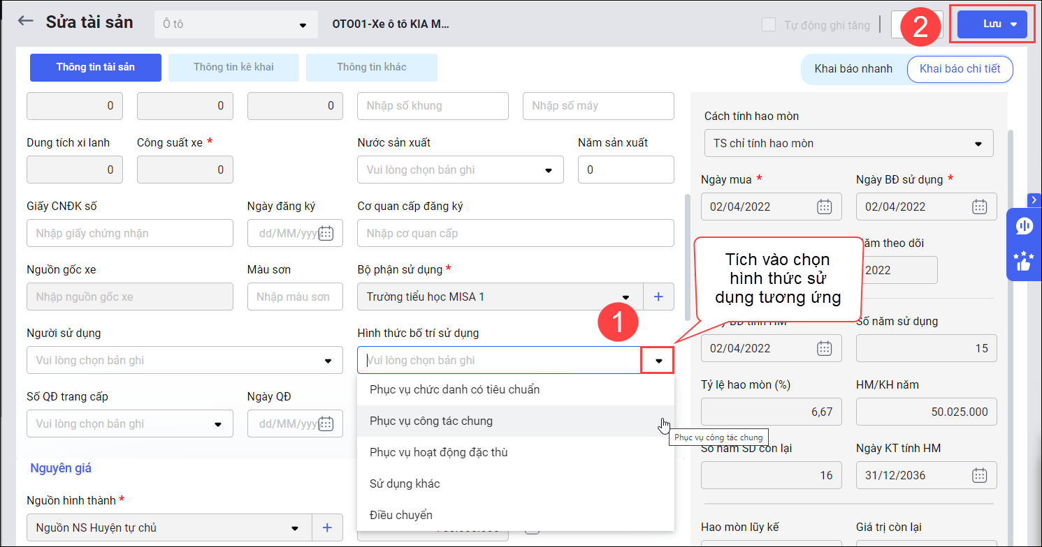 • Điền thông tin vào ô Hình thức bố trí sử dụng (nằm tại Thông tin chung thuộc mục Thông tin tài sản)
