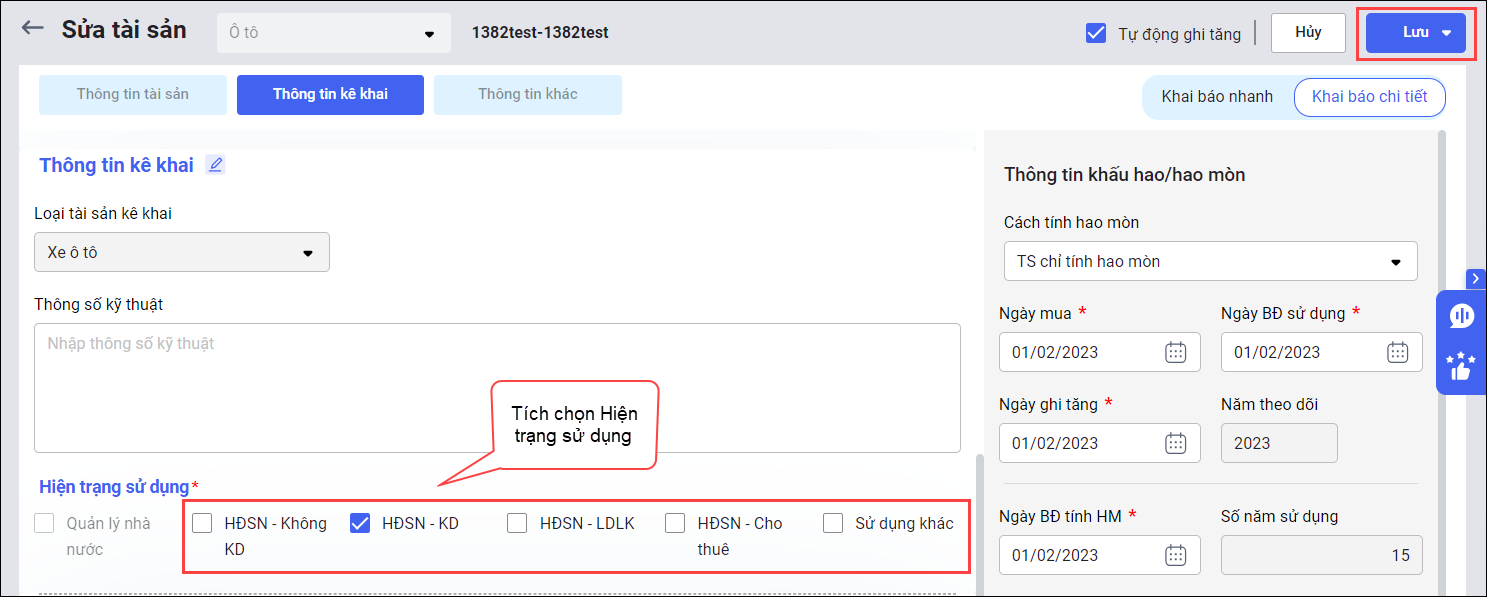 • Ngoài ra đối với đơn vị sự nghiệp sử dụng tài sản kinh doanh, cho thuê, liên doanh liên kết    -> Anh/chị cần khai báo ở mục Hiện trạng sử dụng tương ứng khi khai báo TSCĐ.