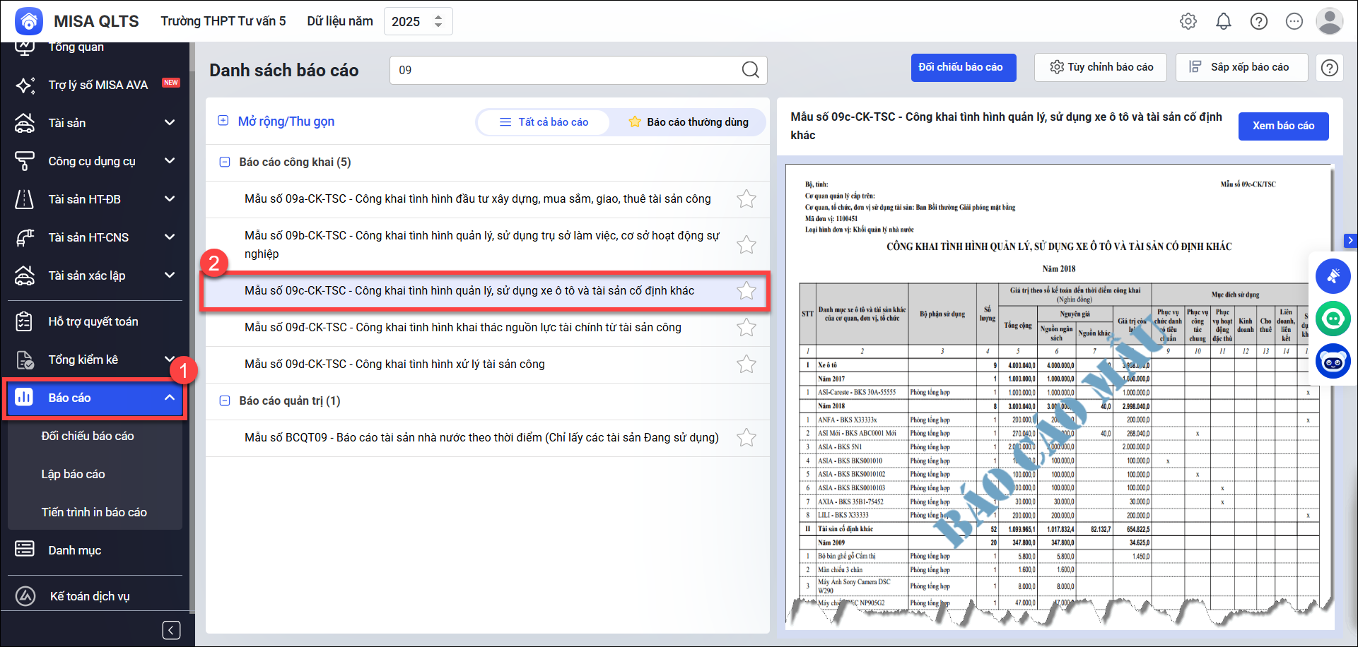 Để in được Mẫu số 09c-CK-TSC – Công khai tình hình quản lý, sử dụng xe ô tô và tài sản cố định khác, Anh/chị thực hiện các bước sau: