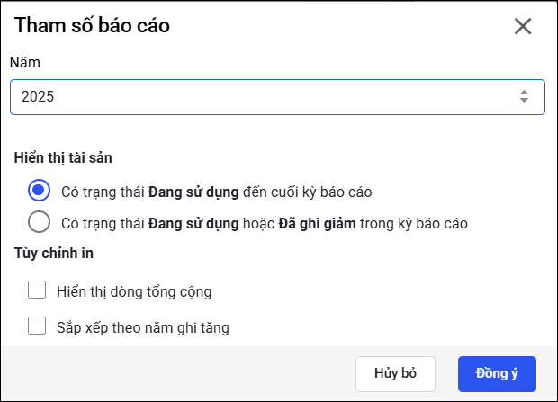 • Các tài sản đã ghi giảm từ năm trước sẽ không hiển thị trên báo cáo này.