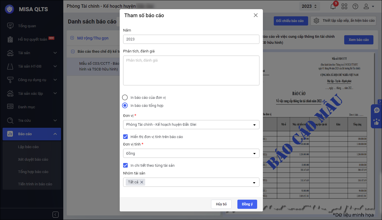 - Chọn In báo cáo tài sản của đơn vị (Để hiển thị số liệu đơn vị) hoặc In báo cáo tổng hợp (Để hiển thị số liệu của các đơn vị được chọn).