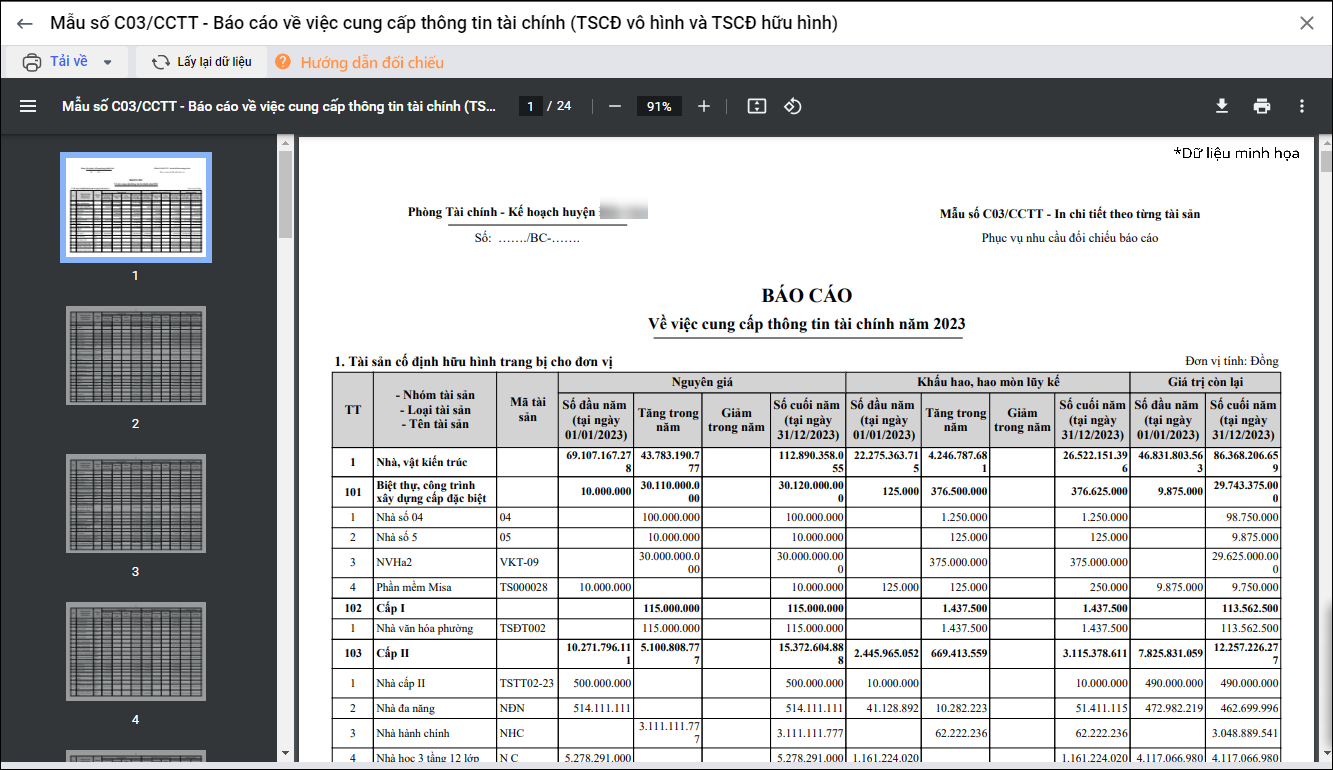 Bài viết này hướng dẫn anh/chị cách in Mẫu số C03/CCTT – Báo cáo về việc cung cấp thông tin tài chính (TSCĐ vô hình và TSCĐ hữu hình) trên phần mềm để nộp cùng báo cáo tài chính năm, đồng thời dùng để tra cứu nguyên giá, hao mòn đầu năm, tăng trong năm, giảm trong năm và số cuối năm của từng tài sản.