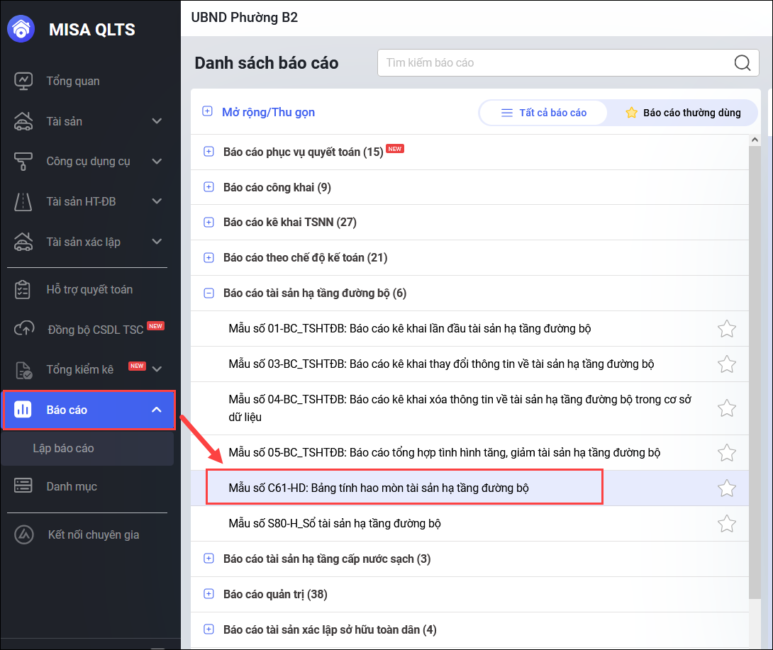 Bước 1: Vào menu Báo cáo\Báo cáo tài sản hạ tầng đường bộ. Tại đây phần mềm đã bổ sung Mẫu số C61-HD: Bảng tính hao mòn tài sản hạ tầng đường bộ.