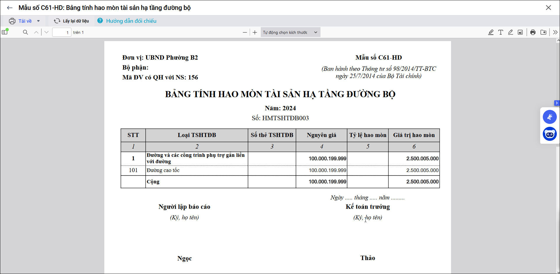 • Kích đúp chuột vào Mẫu số C61-HD: Bảng tính hao mòn tài sản hạ tầng đường bộ.
